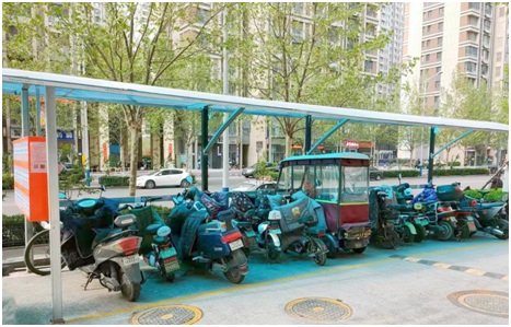 充電樁選址距主體建筑物不能太近,也不能占用救援平臺,更不能占用消防通道。最終,在小區靠近道路位置,引入第三方公司建設運營電動車充電車棚。