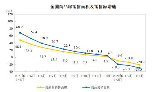 6日,國家統計局發布的數據顯示,今年前四個月,全國商品房銷售額同比下降29.5%,住宅銷售面積同比下降25.4%。