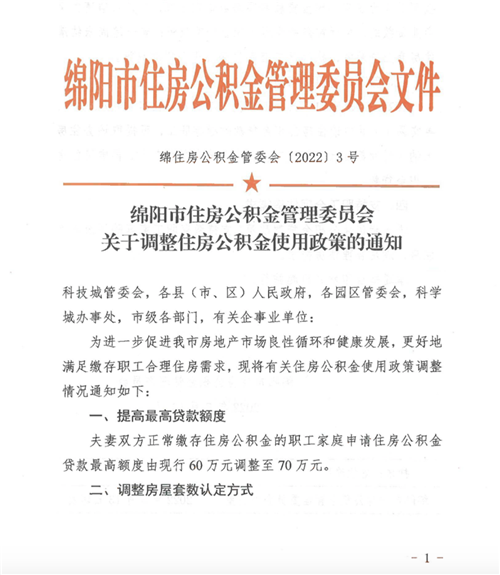 據四川省綿陽市住房公積金服務中心消息,5月16日,該中心下發《關于調整住房公積金使用政策的通知》,提高公積金貸款的額度,夫妻雙方正常繳存住房公積金的職工家庭申請住房公積金貸款最高額度由現行60萬元調整至70萬元。