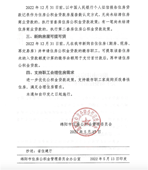 調整房屋套數認定方式。2022年12月31日前,以中國人民銀行個人征信報告住房貸款記錄作為住房公積金貸款房屋套數認定方式,無尚未結清住房商業貸款的,執行首套房住房公積金貸款政策;有一筆尚未結清住房商業貸款的,執行第二套房住房公積金貸款政策。 新購房屋可提可貸。2022年12月31日前,凡在綿陽市新購自住住房(期房、現房、再交易房)并申請住房公積金貸款的繳存職工,可提取該套住房未納入貸款額度計算的繳存余額用于支付首付款后,再申請住房公積金貸款。
