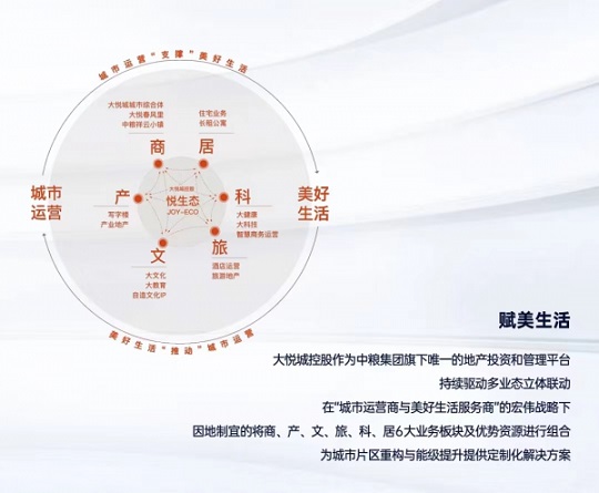 在該模式下,總資產約2000億元的大悅城控股,將商、產、文、旅、科、居六大業務板塊及優勢資源進行有機組合,構建起了業態類型豐富、城市布局完善、資產結構均衡、集人民美好生活場景于一體的“大悅”生態圈。