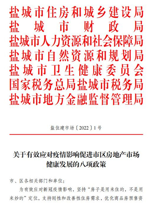 房訊網(wǎng)訊 近日,江蘇省鹽城市住房和城鄉(xiāng)建設(shè)局聯(lián)合多部門出臺(tái)《關(guān)于有效應(yīng)對(duì)疫情影響促進(jìn)市區(qū)房地產(chǎn)市場(chǎng)健康發(fā)展的八項(xiàng)政策》,支持剛性和改善性住房需求,優(yōu)化商品房預(yù)售資金監(jiān)管,促進(jìn)房地產(chǎn)業(yè)健康發(fā)展。