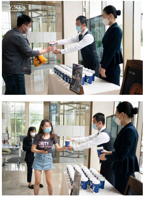 在保證園區內的防疫措施完備的同時,金地威新國際中心將溫情的力量化為復工的助燃劑在樓內進行傳遞,為入駐企業及員工提供更人性化的貼心服務,用一杯咖啡“喚醒美好 按下復工重啟鍵”,打造一份復工的儀式感。活潑陽光的杯貼,香醇濃郁的咖啡,這不僅是一份午后的悠閑時光,更是生活如常,重煥美好的見證。同時也承載著金地威新國際中心之中如一以人為本的運營理念。