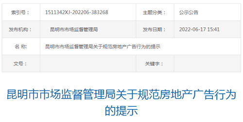 昆明市市場監督管理局于5月至12月開展房地產廣告違法行為專項整治,依據《中華人民共和國廣告法》《房地產廣告發布規定》,擬定了規范房地產廣告行為的提示,現對具體情形提示如下。