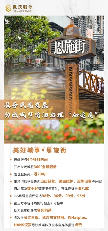 以高品質(zhì)服務(wù)助力城市管理高質(zhì)量發(fā)展,恩施街的煥然一新,就是一個縮影,世茂服務(wù)積極拓寬多元服務(wù)業(yè)態(tài),不斷優(yōu)化提升服務(wù)品質(zhì),致力通過服務(wù)加快助力城市美好煥新,為高品質(zhì)的城市生活增彩添綠。