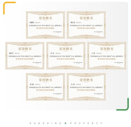 一個成長的物業,離不開每一個奮進勃發的人。他們在本崗位上兢兢業業,同時又承擔起企業文化與技能薪火相傳的責任,讓公司工作開展更加標準化和系統化,良好傳遞了陽光物業學習進取、專業務實的精神。