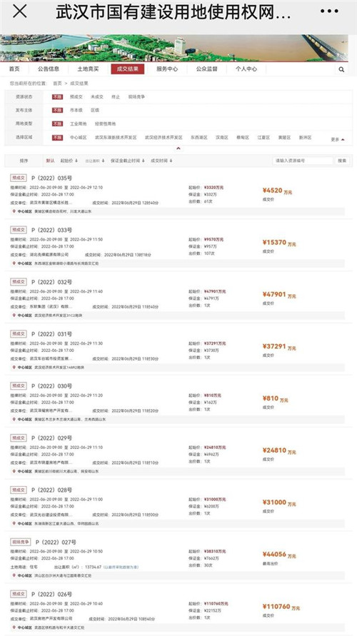 本次土拍共5宗土地產生競價、溢價,其中2宗觸頂“熔斷”。位于洪山區白沙洲大道的P(2022)027號住宅地塊,經5家企業網上競價30輪后觸發“熔斷”,進入“搖號”環節,最終以44056萬元的總價成交,項目溢價率15.00%。此外,新洲區P(2022)019號、東西湖區P(2022)033號、黃陂區P(2022)035號和P(2022)038號等4宗加油加氣站地塊經多輪競價后,分別以20.00%、60.61%、36.14%、9.03%的溢價率成交,未來將有效完善區域的配套服務。