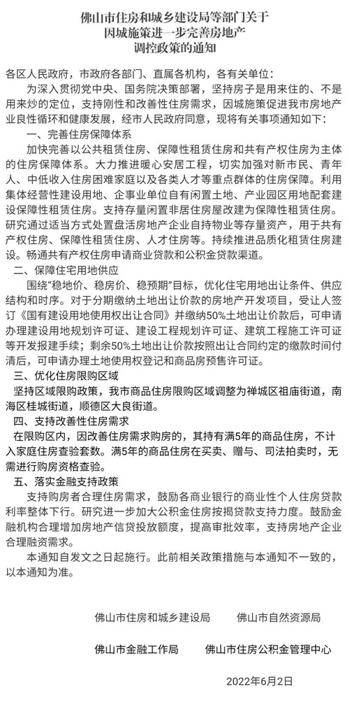 6月2日,《佛山市住房和城鄉建設局等部門關于因城施策進一步完善房地產調控政策的通知》發布,明確佛山商品住房限購區域調整為禪城區祖廟街道、南海區桂城街道、順德區大良街道。