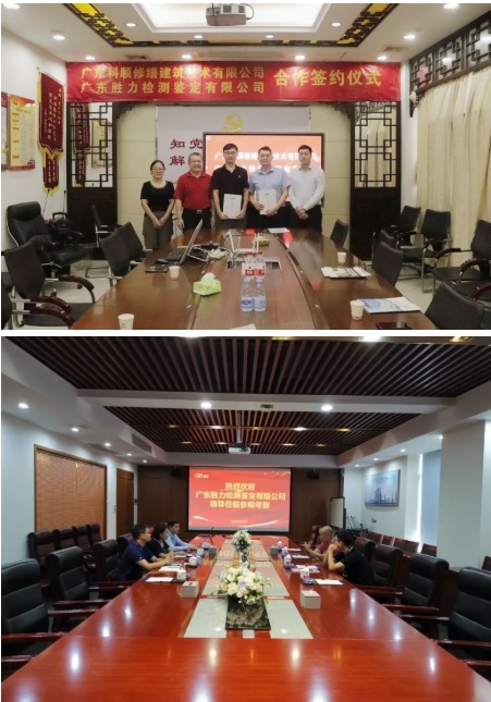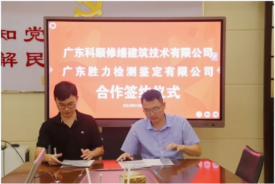 ▲雙方舉行了簽約儀式,共同簽署了《廣東勝力檢測鑒定有限公司與廣東科順修繕建筑技術有限公司的合作協議書》