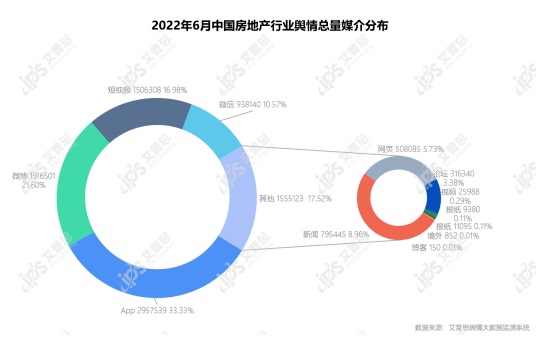 6月,房地產行業輿情聲量來源中,占比最高的媒介為APP,達33.33%,輿情聲量為2,957,539篇次;其次為微博,輿情聲量達1,916,501篇次,占比21.60%;排名第三的是短視頻,輿情聲量達1,506,308篇次,占比16.98%;其他媒介中,新聞、網頁、論壇等媒介的總占比達17.52%,輿情聲量為1,555,123篇次。