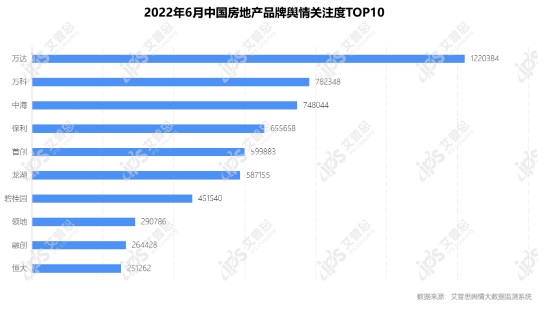 艾普思輿情大數據監測系統顯示,6月,輿情關注度排名第一的房地產品牌為萬達,輿情聲量達1,220,384篇次;其次為萬科,輿情聲量達782,348篇次;關注度排名第三的為中海,輿情聲量達748,044篇次。6月輿情關注度排名前十的房地產品牌如下: