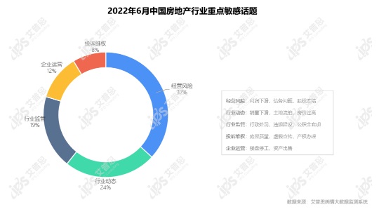 6月,系統監測到與房地產行業高度相關的敏感輿情聲量972,420篇次,占比達10.96%,較上月有小幅抬升,涉及話題“格力地產董事被采取刑事強制措施”、“金科地產票據兌付違約致股權被凍結”等。