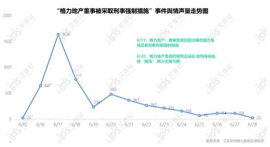 艾普思輿情大數據監測系統顯示,“格力地產董事被采取刑事強制措施”事件輿情聲量為5,125篇次,聲量峰值出現在6月17日(單日聲量1638篇次);輿情聲量在格力地產發布公告后急劇上升,于17日達到峰值后迅速回落。