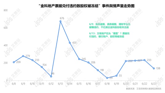 艾普思輿情大數據監測系統顯示,“金科地產票據兌付違約致股權被凍結”事件輿情聲量為3,501篇次,第一個小高峰出現在6月9日,自金科地產回應關注函后,聲量峰值出現在6月13日(單日聲量676篇次),隨后輿情聲量迅速回落,至6月18日降至29篇次,此后輿情熱度在小范圍內波動。