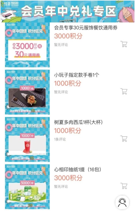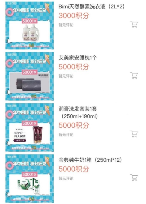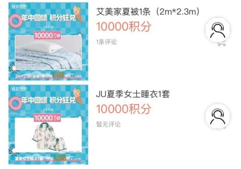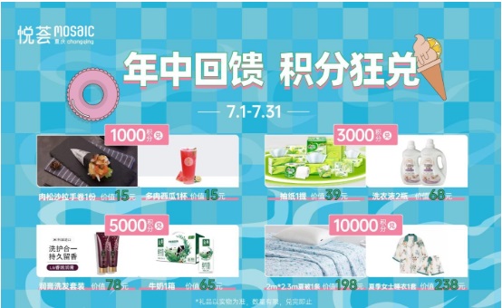 7月1日—7月31日年中大促期間,重慶悅薈誠意滿滿,1000積分兌換小玩子肉松沙拉手卷、樹夏多肉西瓜飲品;3000積分兌換心相印抽紙、酵素洗衣液;5000積分兌換進口洗發水套裝、金典牛奶、艾美家安睡枕;10000積分兌換艾美家夏被、JU夏季女士睡衣,等活動成為活動一大爆點,有效吸引了更多到場客流進店消費,從而獲得了更高的消費轉化率。
