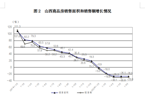 從房地產開發投資增長情況看,上半年,增長的市分別是忻州(55.4%)、晉城(21.4%)、臨汾(4.6%)、呂梁(1.8%)、運城(0.5%);下降的市分別是大同(-2.1%)、陽泉(-8.3%)、長治(-9.9%)、晉中(-16.1%)、太原(-17.9%)、朔州(-27.4%)。增速最高的市與最低的市相差82.8個百分點。從商品房銷售面積增長情況看,上半年,除呂梁市增長1.1%外,其余10個市均為下降,降幅最大的朔州市(-45.3%)與全省平均增速(-26.9%)相差18.4個百分點。