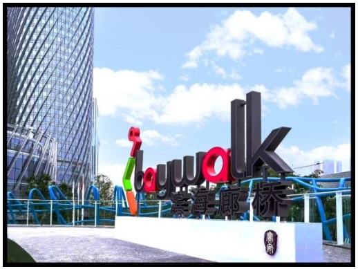 (項目logo 以廊橋的三層(段) 概念、地理圓形造形及具流動感的Baywalk 字體所組成)