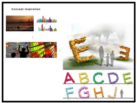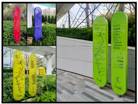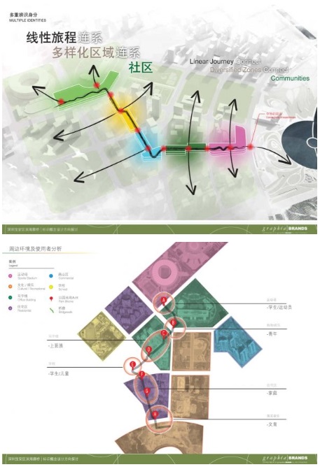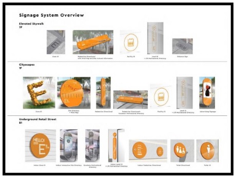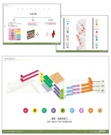 在標識具體設計方面,Graphia革思亞隨著項目的品牌價值定位 - 寶安區的“綠色心臟”來發展,以Logo強調的圓形単體,加上反映城市脈搏跳動的高低節奏剪影,套入區域專屬顏色,創造了“A-J”八區九地的特色地標;再按策略階段定下的標識架構,設計了其馀的標志項目。因應廊橋偌大的戶外空間,Graphia革思亞原建議的標志設計和尺寸是以較活潑多變的大型圖標方式呈現,以助打造現場氣氛,但最終按其他顧問及客方意見把標志縮小及集中于展現其導示功能。