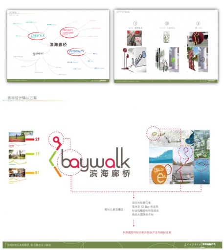 在項目命名、Logo和標識設計方面,Graphia革思亞透過不同角度的概念探討后,最終客戶批核了以廊橋的具體輪廓和三層(段) 概念、加上終點海灣區的地理圓形造形“O”作為圖標,配上直接易記及具流動感的Baywalk字體,組合成為項目的品牌標志。圓形亦成為導視標識系統設計的基本造形。