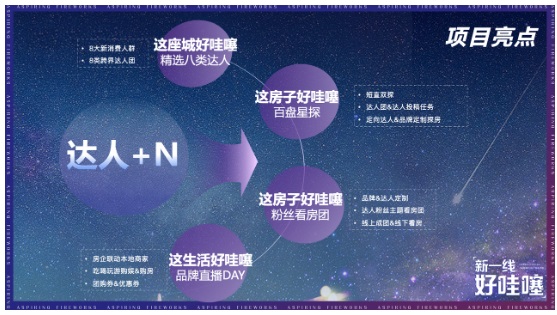 活動以“達人+N”為核心,組合垂類跨界達人圈選、短視頻直播探盤、團購錨點留資、線下粉絲團引流等模式,促進達人內容品效營銷,共同探索新一線城市哇噻的房子與生活,強力提升華中區域市場聲量。