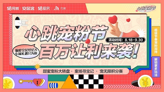 百萬(wàn)鉅惠,心跳來(lái)襲!8月18日-9月30日,由58同城、安居客、58愛房和巧房共同發(fā)起的“818心跳寵粉節(jié)”活動(dòng)盛大開啟。本次活動(dòng)將聚焦用戶看房、選房、訂房核心場(chǎng)景升級(jí),緊緊圍繞經(jīng)紀(jì)人線上數(shù)字化營(yíng)銷需求,通過全面升級(jí)互動(dòng)玩法、創(chuàng)新活動(dòng)落地形式、百萬(wàn)鉅惠送福利等方式,全面助力B端合作伙伴提升機(jī)構(gòu)交互粘性,以節(jié)日營(yíng)銷+造節(jié)氛圍,結(jié)合運(yùn)營(yíng)政策讓利為合作機(jī)構(gòu)及KA機(jī)構(gòu)賦能,全面助力C端用戶安心鉅惠選好房!