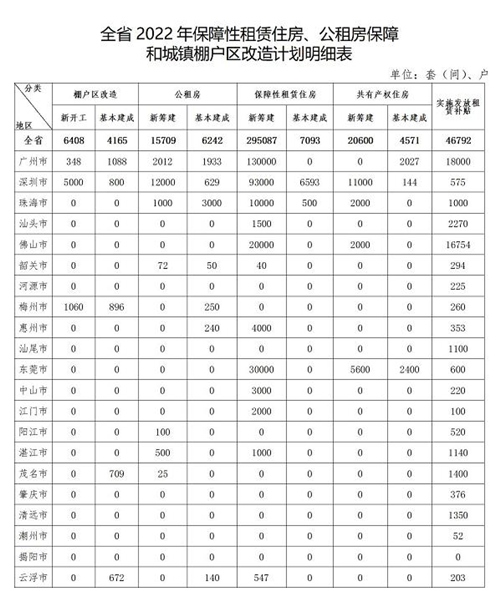 廣東省近日公開的《2022年保障性租賃住房、公租房保障和城鎮棚戶區改造計劃》顯示,2022年,廣東省計劃新開工棚戶區改造房6408套,新籌建公租房1.57萬套、保障性租賃住房29.51萬套、共有產權住房2.06萬套。