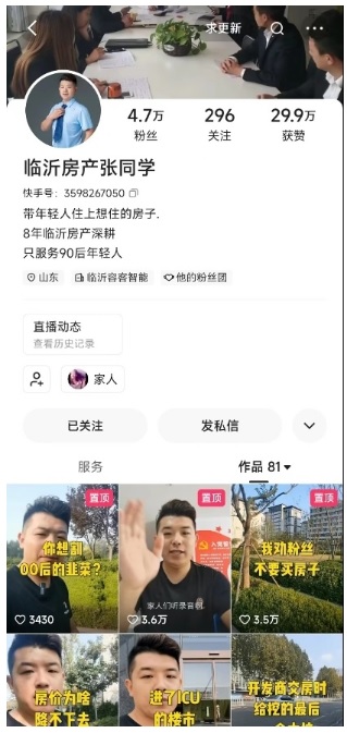 做了8年的線下二手房運營,張鵬(快手ID:臨沂房產(chǎn)張同學)從下決心轉(zhuǎn)行快手房產(chǎn)主播的那一刻起,便抱著“未來不設(shè)限”的發(fā)展信念。只是讓張鵬沒想到的是,在邁出從線下到線上、從幕后到臺前的這一步后,自己的發(fā)展會如此迅速,在不到2個月時間內(nèi)漲粉4.7萬,成為臨沂房產(chǎn)主播陣營內(nèi)的一匹黑馬。