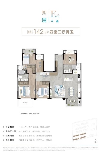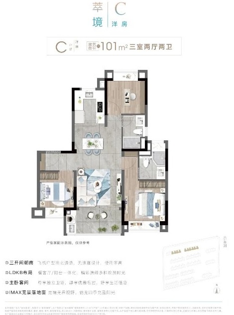 建面約100㎡的高層B戶型將南向三開間和餐客廳一體化設計完美融合。更在空間尺度上進行了大膽升級,尤其是南北通透的主臥套房設計,讓居住體驗達到極致舒適。