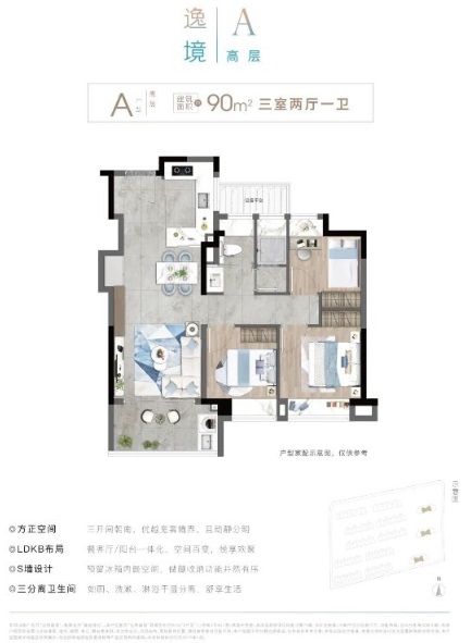 建面約90㎡的高層A戶型小戶型最令人頭疼的就是收納問題,但是金地嘉境這次產(chǎn)品的升級,無疑讓我們不用再為收納煩惱看似常規(guī)的三開間布局,但左側入口的S型墻體設計使其大不同。創(chuàng)新改造帶來閑置墻面變?yōu)轫斕炝⒌厥占{柜的變化。入口處可規(guī)劃整體鞋柜,大S處可放置雙開門冰箱?蛷d整面墻成為電視收納柜,空間實用性大大提升。我們把目光在聚集在衛(wèi)生間,這次他們很用心的打造了一個三分離的衛(wèi)生間,這樣的設計能讓生活品質上升N個臺階。