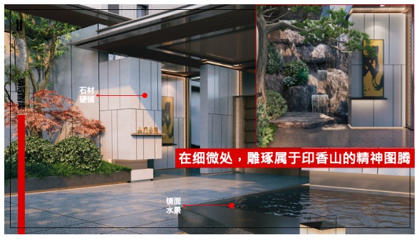 石材做豎向雕琢,底層有一汪波光瀲滟的鏡面水景,帶著一抹禪意,讓人能自然地放慢腳步,回到“馬上到家了”的情緒場中。
