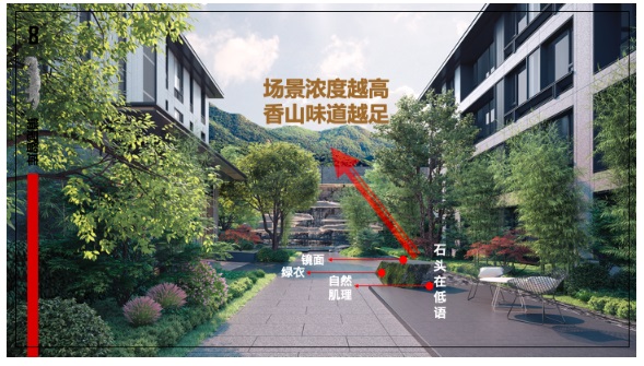 這一扭,讓產(chǎn)品成功做到依山勢而建,與香山擁有了更好的親密關(guān)系,也讓香山更好地成為印香山的靠山——