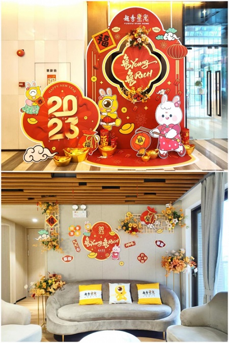 在越秀星寓三元里店,管家們貼上新年窗花,門口萌兔迎門,前臺(tái)紅色金色搭配的福筒插花,帶來喜氣洋洋的節(jié)日氛圍!