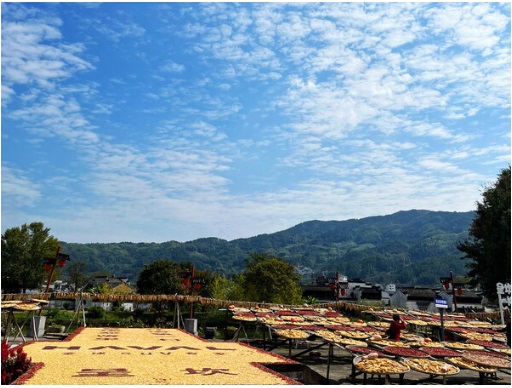 第二站,員工們來(lái)到了黃山市呈坎村。呈坎村門(mén)口有一平安坎,據(jù)傳說(shuō)跨過(guò)即可一生無(wú)坎,大家懷著對(duì)未來(lái)的期待與祝福依次跨過(guò),增添了本次出行的樂(lè)趣。秋季的呈坎,彌漫著豐收的喜悅,當(dāng)?shù)卮迕窭们绾锰鞖猓瑢偝鍪斋@的農(nóng)作物晾曬到村中的曬場(chǎng),五顏六色的農(nóng)作物被拼成精美的圖案。離開(kāi)了城市中的鋼鐵建筑,員工們沉浸在鄉(xiāng)村的自然風(fēng)光中,借助豐收的盛景,一起為公司發(fā)展獻(xiàn)上誠(chéng)摯祝福。