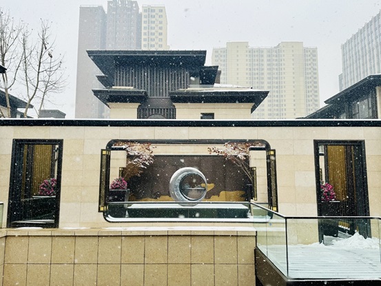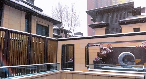 與庭前賞雪相得益彰的,還有魯能·釣魚臺美高梅別墅古樸典雅的中式建筑美學。雙坡屋頂、飛檐斗拱、銅制格柵、門堂回紋、詩畫景墻……每一處精心設計都深得傳統居住之精髓,將中式建筑的清雅含蓄、端莊豐華體現得恰到好處,簡潔的建筑線條在銀裝素裹的世界里,更顯清雅幽深的古風美意。
