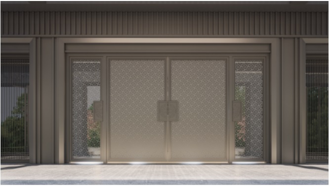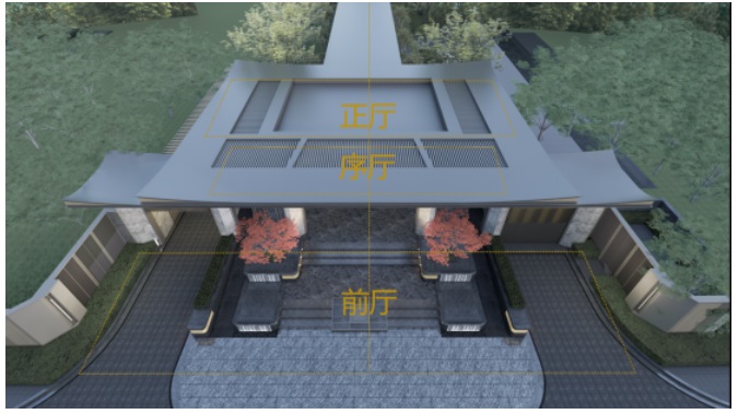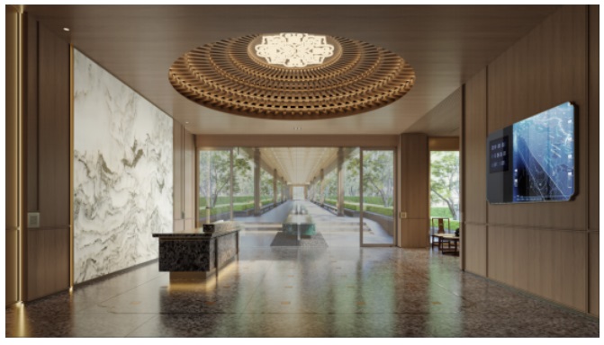 “禮”是秩序。望京國譽府大門,采用三進制入門禮制,營造前廳、序廳、正廳,彰顯門戶歸家秩序。其中前廳是大門外的露天區(qū)域,穿過前廳,拾階而上,即是巍峨的第一重儀門,“序廳”相當(dāng)于是屋檐的延伸,功能上增加了檐下灰空間,銜接“前廳”與“正廳”,起起承轉(zhuǎn)合之意。正廳為星級酒店式社區(qū)大堂,集合接待流線、歸家流線等多條獨立動線,互不干擾,給予更佳舒適的歸家體驗和儀制感受。