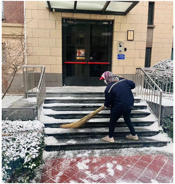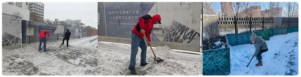 為了確保園區各出入口、道路等區域暢通,龐麗帶領著其他工作人員緊鑼密鼓地清理積雪。由于園區有很多死角區域無法用機器清理,只能靠人工一點一點鏟除,為了加快效率,龐麗在13日晚上就啟動應急預案,安排人員分組、分片、分區地開展除雪任務。她和物業服務團隊一起努力與時間賽跑,與天氣賽跑,實時關注著雪量情況,及時進行清掃。