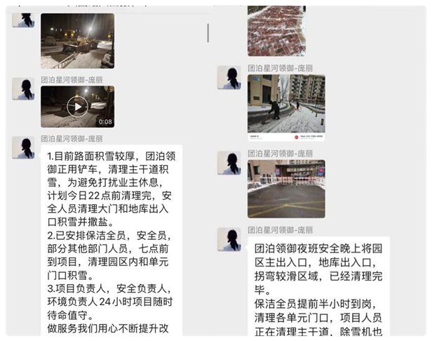 此外,各小區還通過業主群、朋友圈等方式傳遞下雪天的注意事項,同時加強對困難群體、獨居老人的慰問走訪,叮囑他們做好保暖御寒準備。物業服務團隊的點滴付出,業主們都看在了眼里,紛紛豎起了大拇指,業主群內也是連連稱贊。