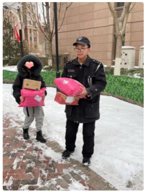 風雪中,除了保障業主出行,天津星河智善生活的溫暖服務也熨帖了業主們的心。剛下完雪的一天,正在清理積雪的安全員楊寶琪看到一個女孩抱著許多快遞艱難地走在寒風中,甚至看不清前面的路,下一秒可能就要滑倒。楊寶琪見狀趕緊上前幫忙,接過女孩手中的快遞,幫她一起將快遞送回家中。