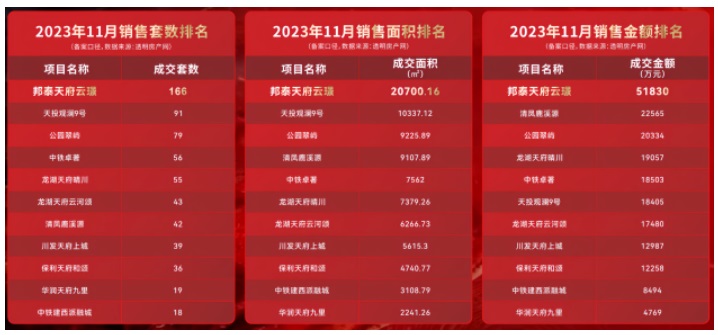 說到產品,四川邦泰被人津津樂道的在售產品就不得不提“以超配敬天新”的邦泰·天府云璟。今年10月28日首開,114、130平當日上午即清盤,143、170平也只剩少量房源,勁銷5億元;在短短兩個月左右,已累計實現銷售金額近9.5億元,到訪超過6000組;11月數據顯示,在天府新區獲得銷售套數、銷售金額、銷售面積三項領先。而在近日,項目迎來了第5批次的加推,再次引發高關注,成交火熱。毫無疑問,客戶用真金白銀票選出了天府新區當下的矚目新星。