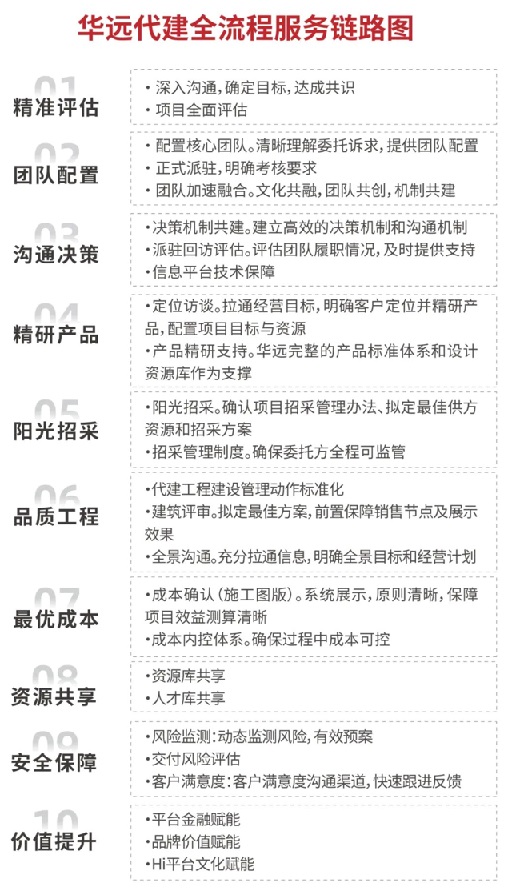從當初的摸著石頭過河到現在的精細化運營管理,華遠地產的代建業務已經打磨出一套符合行業生態發展的創新閉環模式,即從營運、產品、成本、工程、服務、權責六大方面,梳理華遠代建管理體系的核心價值,在全流程服務鏈路中建立委托方全程“能參與、可控制、強監督”的管控體系,為委托方提供全面的支持和保障。