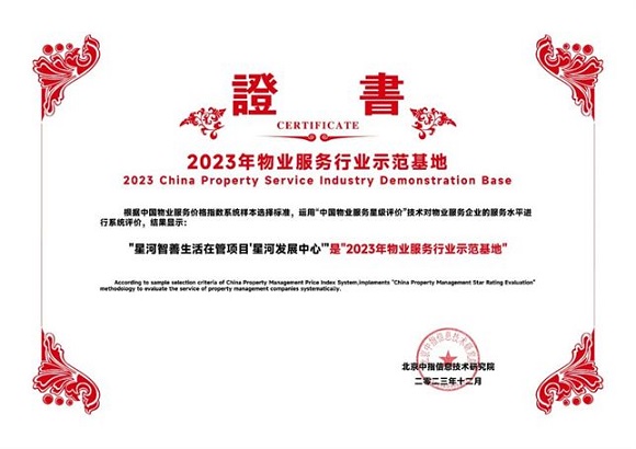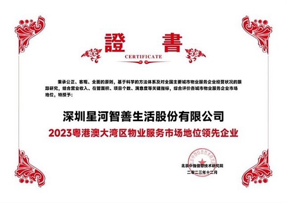 星河智善生活憑借業內領先的綜合實力和服務水平,榮獲“2023粵港澳大灣區物業服務市場地位領先企業”、在管項目星河發展中心被評為“2023物業服務行業示范基地”。