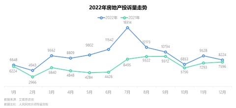 2022年,人民網地方領導留言板共收到房地產投訴約11.71萬起,與去年同期相比增長53.27%。本年度各月投訴量均大于去年同期,其中7月為投訴高峰(1.83萬起)。值得關注的投訴事件有:西安市紫薇東進違規交房且房屋質量不達標、南寧市興進珺府延期交房且質量不達標、菏澤市佳和雅園質量不達標。