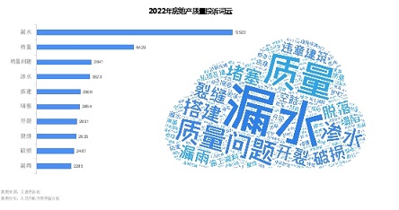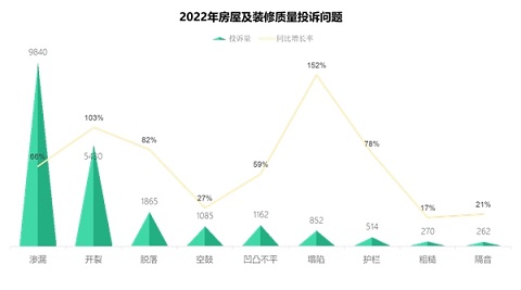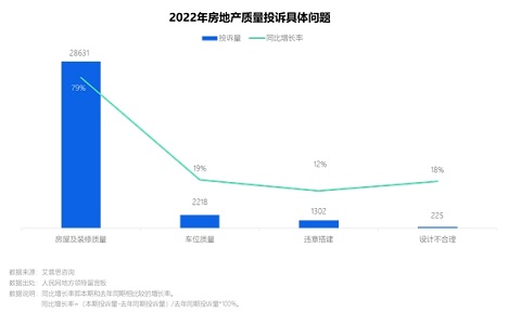 2022年,質量投訴中房屋及裝修質量相關投訴28631起,較去年增長79%;車位質量相關投訴2218起,較去年增長19%;違章搭建、設計不合理相關投訴分別為1302起、225起。