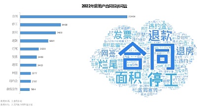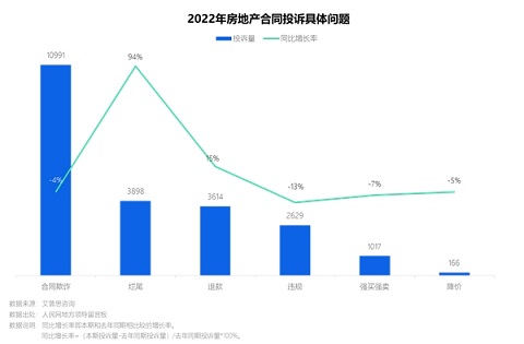 2022年,合同類投訴中合同欺詐投訴量10991起,較去年下降4%,主要涉及面積縮水、虛假宣傳等問題;爛尾投訴3898起,較去年增長94%;退款投訴3614起,較去年增長15%。此外,違規、強買強賣、降價相關投訴較去年均下降。