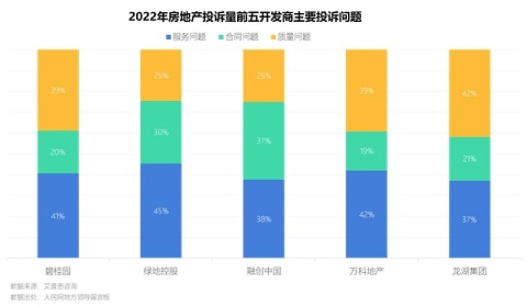 從投訴分類來看,2022年綠地控股、萬科地產、碧桂園服務問題居多,占比均在40%以上;龍湖集團質量投訴較多,占比42%。與其他四者相比,融創中國收到的合同投訴最多。