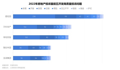 2022年,投訴量前五開發商質量投訴具體問題中,滲漏、開裂為主要問題,碧桂園收到滲漏相關投訴236起、開裂相關投訴119起,萬科地產收到的滲漏、開裂相關投訴分別為134起、92起;綠地控股收到的滲漏、開裂相關投訴分別為150起、83起;此外,碧桂園收到的脫落、空鼓相關投訴均在40起以上。