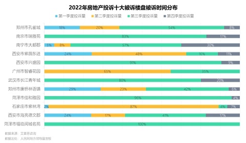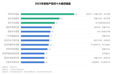 2022年熱度較高的房地產投訴事件有:西安市紫薇東進違規交房且質量不達標(51起)、南寧市興進珺府延期交房且質量不達標(32起)、菏澤市佳和雅園質量不達標(44起)等。