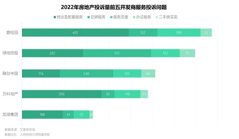 服務投訴方面,碧桂園、綠地控股、融創中國收到的物業及配套服務、交房服務、服務態度相關投訴均較多,都在100起以上;萬科地產收到的物業及配套服務、服務態度相關投訴較多,分別為366起、119起;龍湖集團收到的投訴主要集中在物業及配套服務。