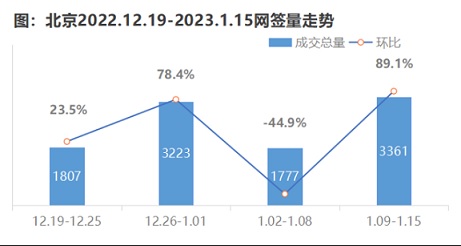 根據北京住建委官網數據顯示,1月1-27日全市二手房網簽6686套,環比上月同期上漲4.6%。拋開春節假期網簽暫停的因素,1-15日,北京二手房網簽5152套,環比上月同期上漲51.6%,實際上,從2022年12月最后一周開始,二手房交易量已顯著增加。