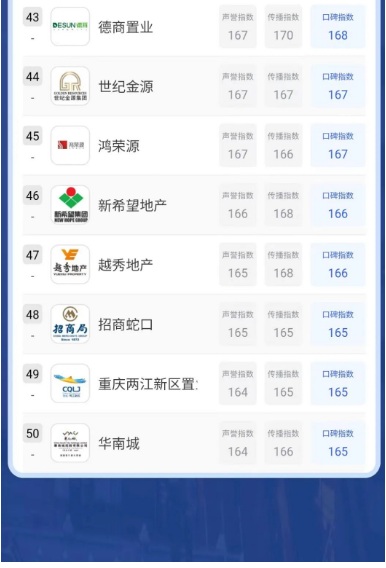 2022年線上口碑指數位列前三的房地產品牌為:萬達集團(口碑指數883)、龍湖集團(口碑指數560)、保利發展(口碑指數540)。其它上榜TOP50的房企包括:碧桂園、萬科地產、首創集團、雅居樂集團、招商蛇口、重慶兩江新區置業等。